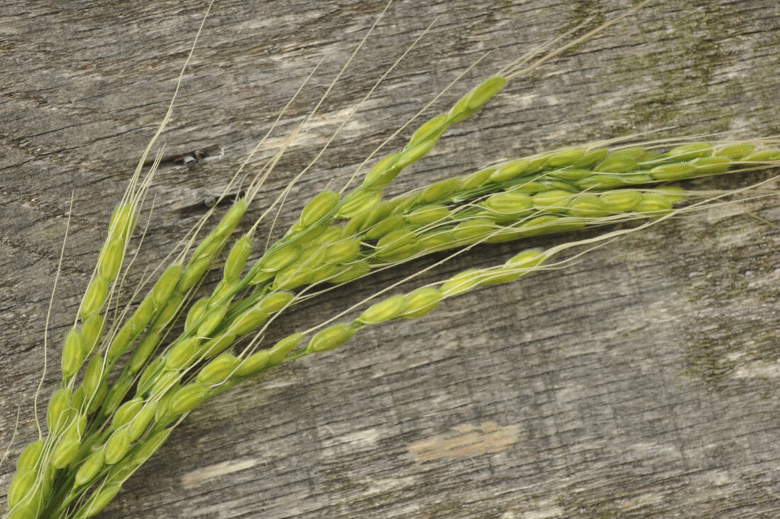 Duborskian rice, a Russian short-grained dryland, or “upland” rice, is a highly ornamental plant that can even be grown in containers, where its 2-foot-tall green and gold panicles will lend height and beauty to the center or rear of mixed planters.