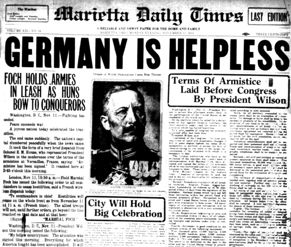 The Marietta Times from that day in 1918 is a remarkable example of history being reported as it was happening. With international, national and local coverage, the front page gave a great overview of the events on the day they occurred.