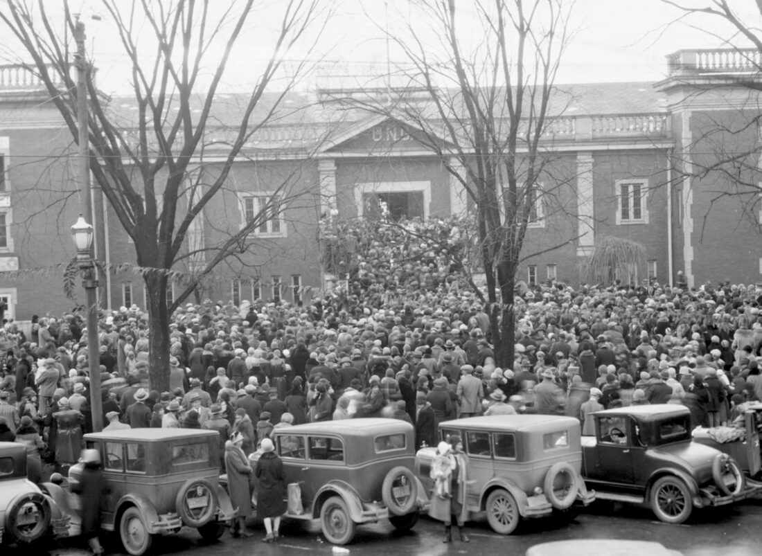 (Photo provided from Marietta College Special Collections, Harry Fischer Collection) Christmas at the Armory, circa 1929. Santa is the white spot at top of steps.