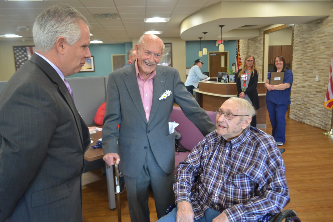 PEYTON NEELY The Marietta Times Mark Murdock, acting director of the Marietta VA Clinic, talks with World War II veterans Herman Zerger, 93, of Woodsfield, and Albert Hupp, 98, of Summerfield, during the one-year anniversary celebration at the new location on Wednesday.