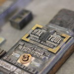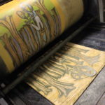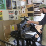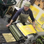 A poster for the Yellow Springs Brewery receives its final layer of black ink on a Vandercook Proof Press.