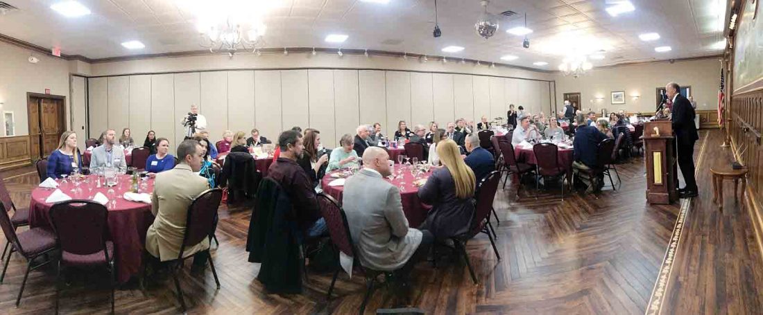 - Jim Wharff, right, addresses a gathering of Belpre, Marietta AM and Marietta Noon Rotarians Thursday in the Lafayette Ballroom. (Photo by Janelle Patterson)
