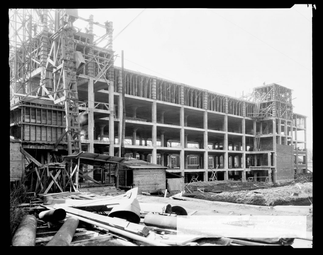 Photo from the Harry Philip Fischer Collection, Marietta College An April 2, 1926 photo shows the expanded production building of the Safe Cabinet Company under construction on Greene Street. The structure was designed by Schenk and Williams Architects of Dayton and built by R.R. Kitchen and Co. of Wheeling, W.Va.