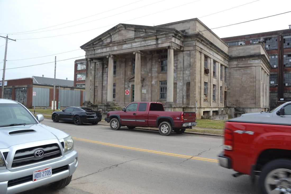 MICHAEL KELLY The Marietta Times Vehicles pass the Remington-Kardex property on Greene Street Friday afternoon. The buildings have remained largely vacant for decades.