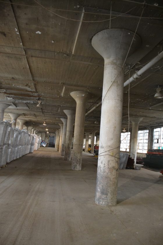 Beyond the several thousand square feet occupied by Westwater, the building remains much as it was when built. Mushroom concrete pillars march in columns down hundreds of feet of high-ceilinged, open space, naturally lit by banks of big casement windows on all the walls, giving the abandoned factory a bright, airy feel.