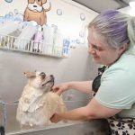 - Lucy Filipow bathes her dog Nelly, a 13-year-old pug, in the Comfort Clips mobile dog grooming trailer outside her Marietta home. (Photo by Michael Kelly)
