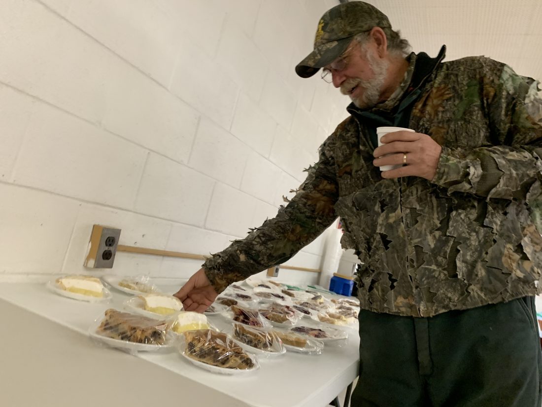 Photo by Janelle Patterson Tom Richards, of Parkersburg, grabs a lemon meringue pie while stopping for lunch at the Cutler Community Center Wednesday between morning and afternoon hunting in Cutler.