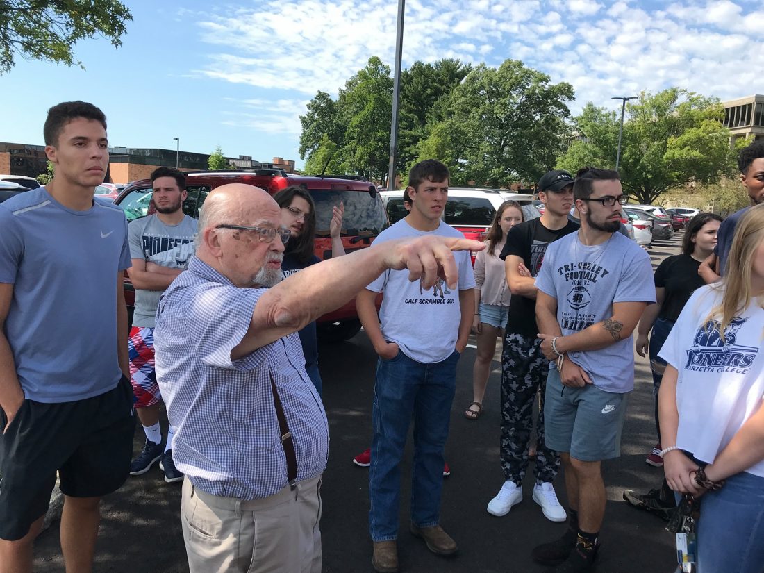 Photo courtesy of Matt Young Dr. Jerry Lewis, retired Kent State University professor, describes his experiences on May 4, 1970, to Marietta College students during a private tour in the fall of 2019. The students and professor stand in the parking lot on the Kent State campus where several students were killed or wounded. Lewis was one of the faculty members who played an instrumental role in convincing students that further demonstrations would only lead to more bloodshed.