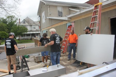 Photo by Janelle Patterson Aluminum coated steel sheeting gets adhesive glue applied Thursday as part of the kitchen remodel at The Busy Bee in Marietta.