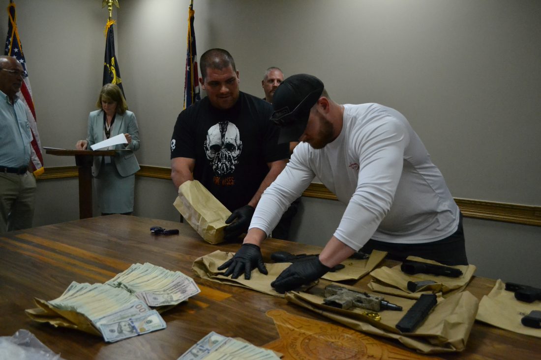 Photo by Michele Newbanks Before a press conference Thursday afternoon at the Washington County Courthouse, two agents of the Washington Morgan Monroe Noble Major Crimes Task Force lay out items that were seized in a drug bust Wednesday night.