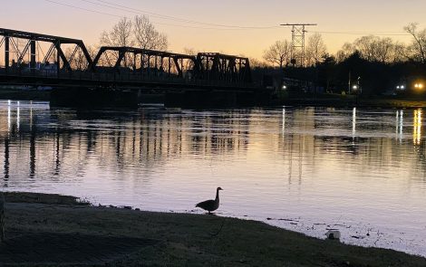 AT LEFT: A goose looks out over high water in Marietta at the Armory parking lot on Friday.