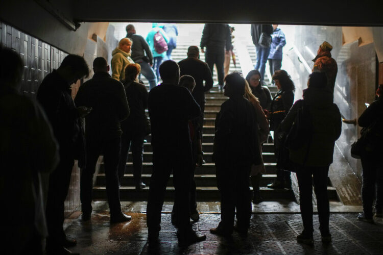 People shelter in a subway station after a Russian shelling in Kharkiv, Ukraine, Monday, Oct. 10, 2022. Explosions on Monday rocked multiple cities across Ukraine, including missile strikes on the capital Kyiv for the first time in months. (AP Photo/Francisco Seco)
