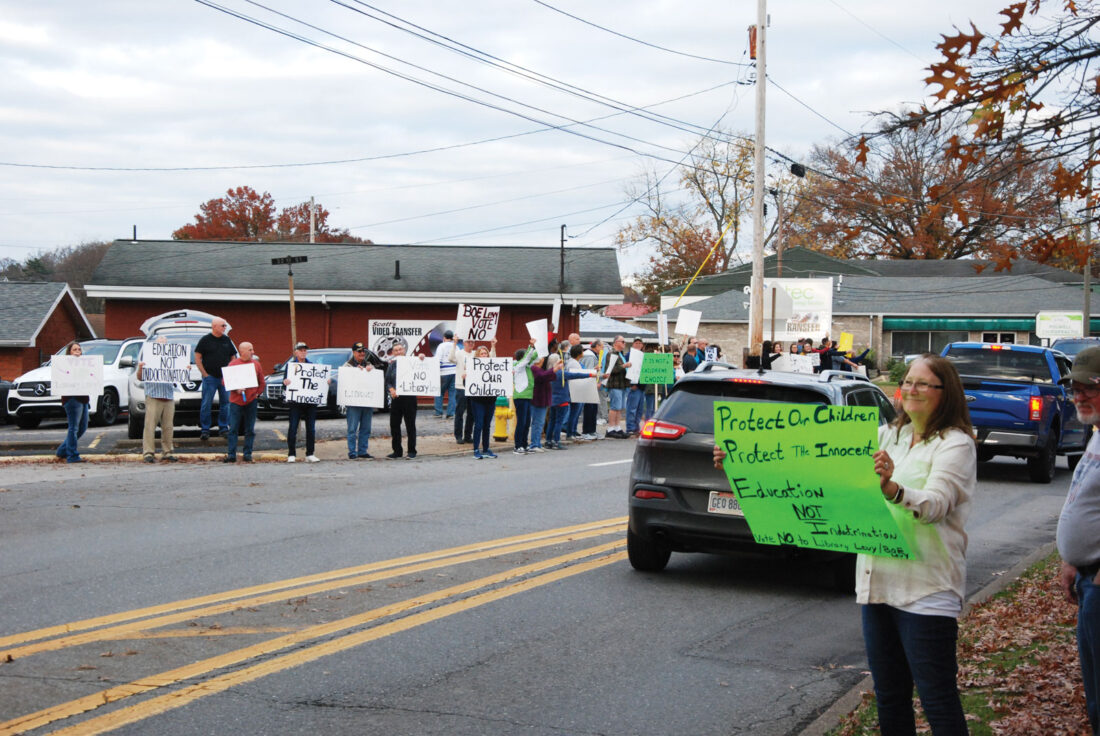 A protest was organized Tuesday evening along Emerson Avenue in front of the library’s main branch by the Mid-Ohio Valley Citizen Action Coalition. Demonstrators carried signs urging motorists to vote against the library levy, as well as a Wood County Schools renewal levy.