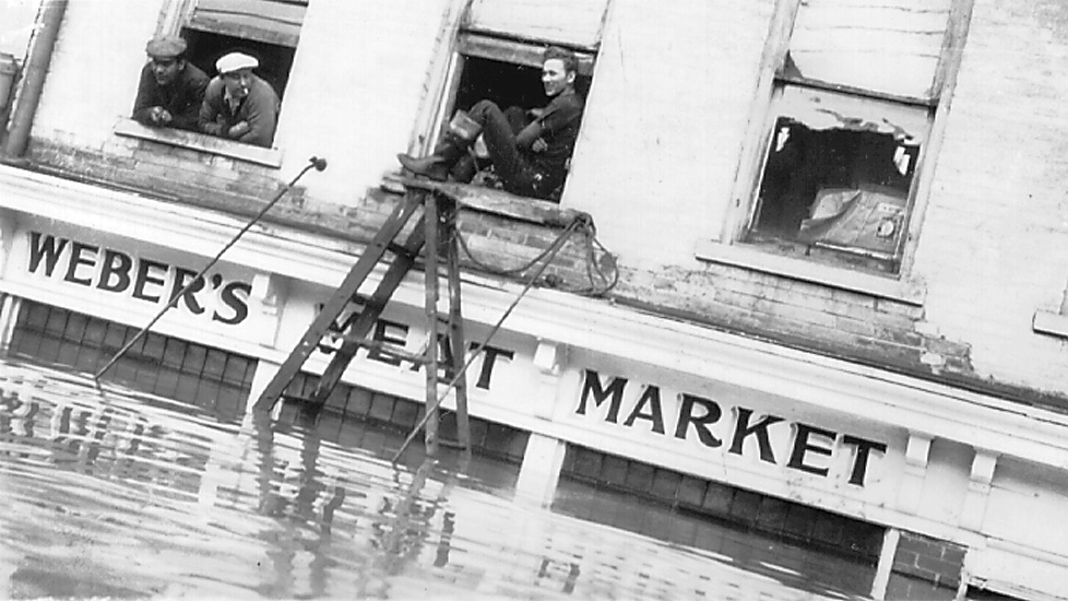 - Flood water completely covered the first floor of the Weber’s Meat Market. (Photo courtesy of the Marietta College Legacy Library, Slack research collection.)
