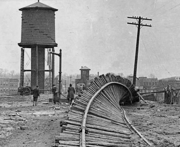 - Rails leading to the Muskingum bridge were twisted by the flooding Muskingum River. (Photo courtesy of the Marietta College Legacy Library, Slack research collection.)