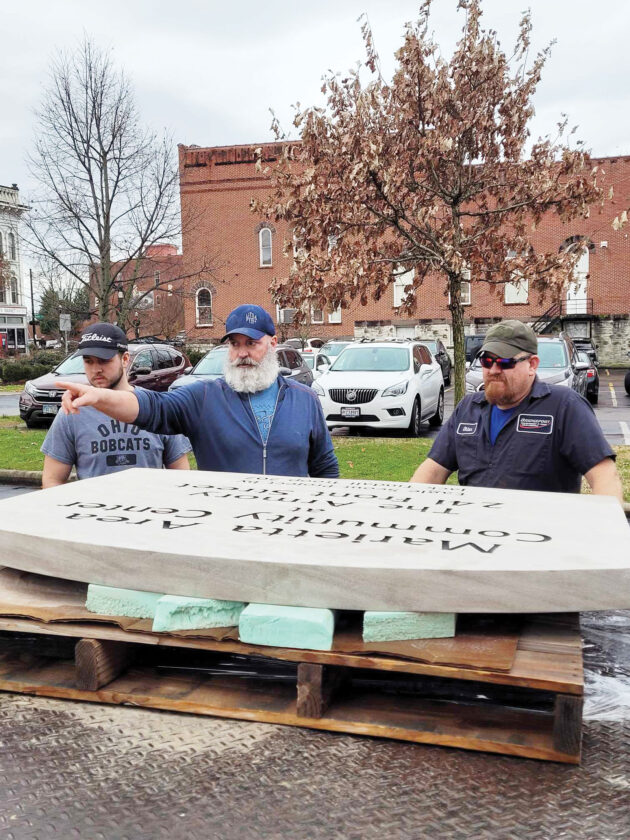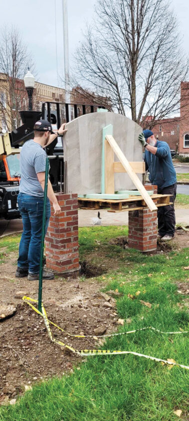 - Jack Tindall, left, and another worker balance the limestone sign on a brick base placed in front of the Marietta Armory on Dec. 9. (Photo Provided)
