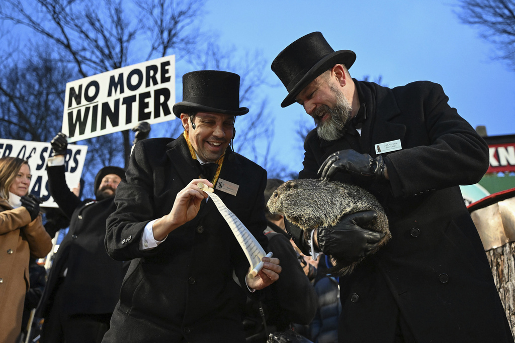 - Groundhog Club handler A.J. Dereume holds Punxsutawney Phil, the weather prognosticating groundhog, as vice president Dan McGinley reads the scroll during the 138th celebration of Groundhog Day on Gobbler’s Knob in Punxsutawney, Pa., Friday, Feb. 2, 2024. Phil’s handlers said that the groundhog has forecast an early spring. (AP Photo/Barry Reeger)
