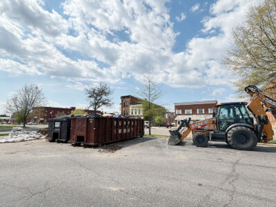 - Dirty mattresses and other debris can be seen in two dumpsters provided for free by Rumpke in the Parking Partners lot on Second Street in Marietta on Monday. Marietta residents can put their flood debris in the dumpsters. (Photo by Michelle Dillon)