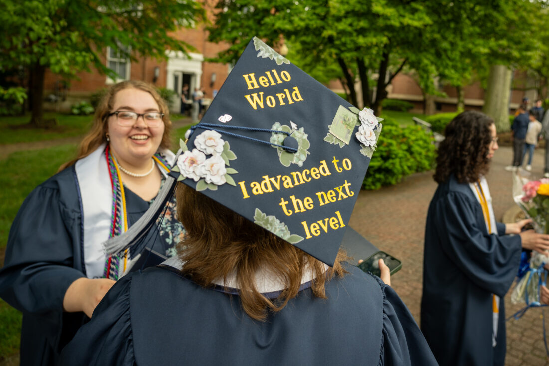 - Joyce McSherry, of Belpre, displays the message on her cap during Saturday’s Marietta College commencement as fellow student Sierra Sinclair of Little Hocking looks on. (Photo provided)