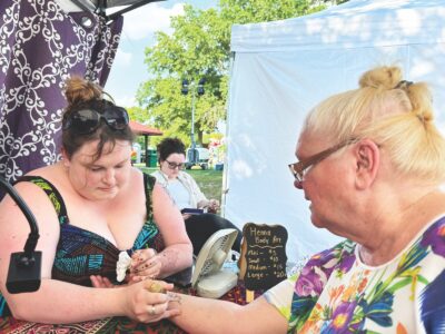 Courtney Knoch, owner of Marietta Henna, left, gives Parkersburg resident Martha Klimas a henna tattoo on the first day of the Mid-Ohio Valley Multi-Cultural Festival Friday evening. (Photo by Michelle Dillon)