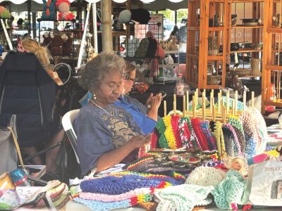 - Lily Webb, owner of Products by Lily, who is from Tennessee, crochets a hat at her booth during the Mid-Ohio Valley Multi-Cultural Festival Friday evening. (Photo by Michelle Dillon)