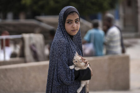 - A Palestinian girl carries her cat as she evacuates a school that had been her shelter, in eastern Deir al-Balah, Gaza Strip, Friday, Aug. 16, 2024, after the Israeli military dropped leaflets asking civilians to evacuate from the area, saying forces plan to respond to rocket fire that targeted Israel. (AP Photo/Abdel Kareem Hana)