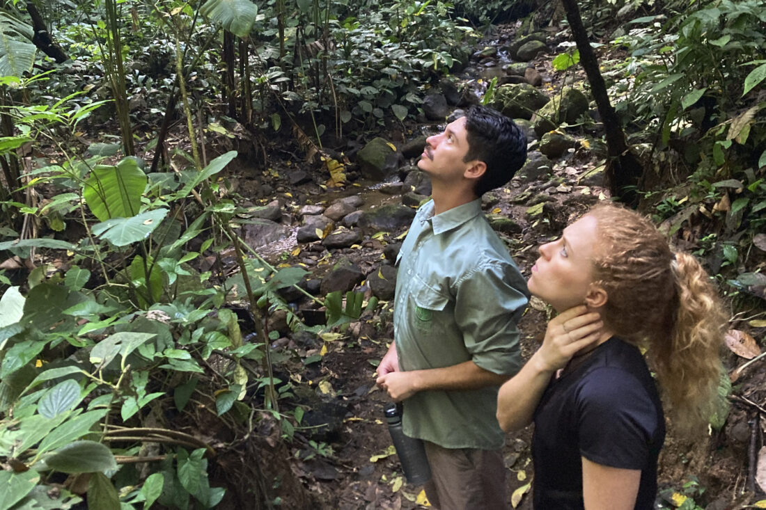 FILE - Biologists Jim Córdoba-Alfaro, left, and Jenna Lawson listen for the sounds of endangered Geoffrey's spider monkeys at the private Rio Nuevo Nature Reserve on the Osa Peninsula in Costa Rica, on March 20, 2023. (AP Photo/Matt O'Brien, File)