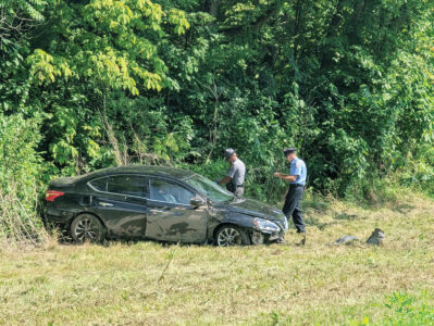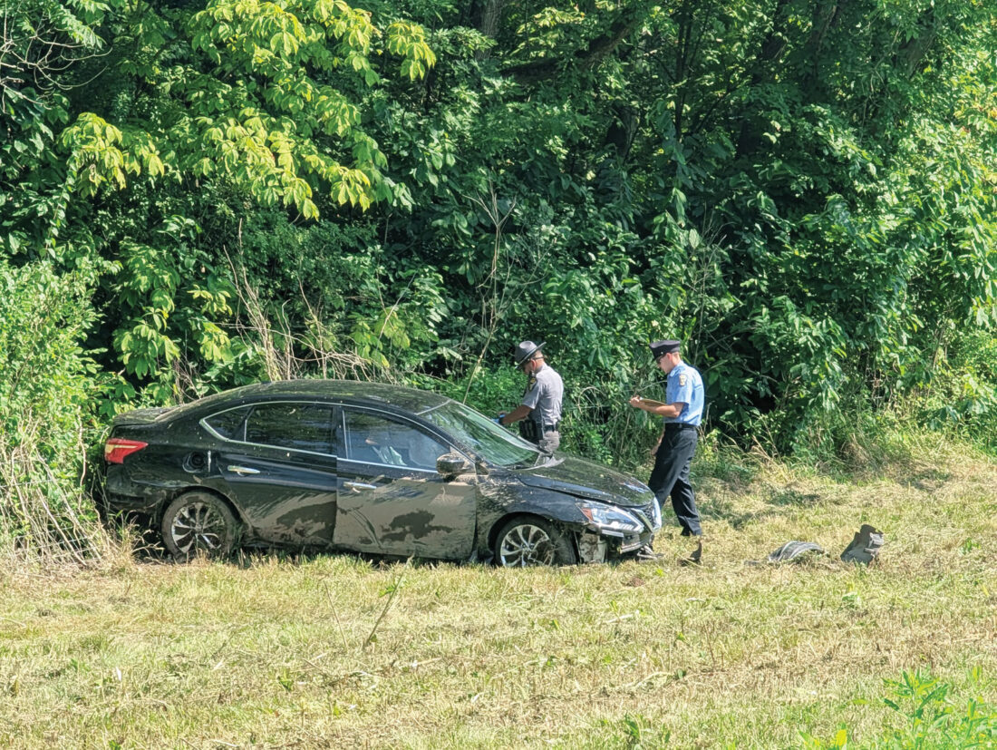 - Troopers from the Ohio State Highway Patrol look over a Nissan Sentra that was involved in a pursuit that began in Athens County Friday afternoon and crashed on Ohio 7 north of Belpre. (Photo by Evan Bevins)