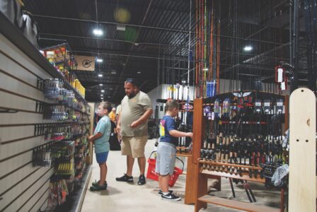 Parkersburg resident Ryan Wilt and his sons Whalen, left, and Ryan Jr. look over the fishing equipment at Green’s Supply Depot in Parkersburg shortly after the store officially opened Tuesday. (Photo by Evan Bevins)