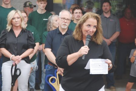 - Green’s Supply Depot co-owner Debbie Kimble, right, speaks before a ribbon-cutting at the new Parkersburg store Tuesday. Kimble is from the area and graduated from Williamstown High School. (Photo by Evan Bevins)