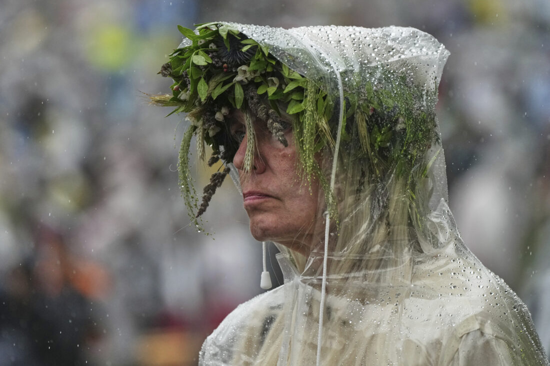 - A spectator braves the rain as she watches the song festival, part of the “Iseoma” Song and Dance Celebration, at the Song Festival Grounds in Tallinn, Estonia, Sunday, July 6, 2025. (AP Photo/Sergei Grits)