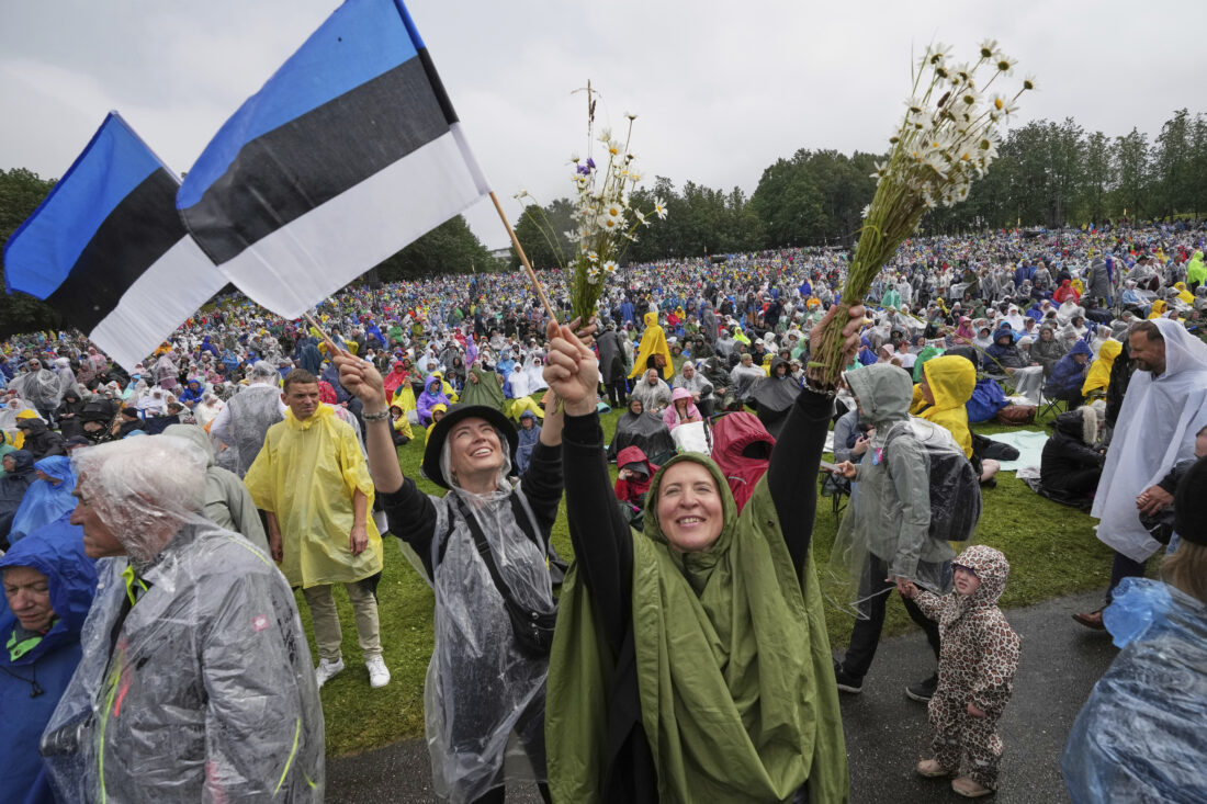 TALLINN, Estonia (AP) — The voices of tens of thousands of choir singers rang out in the rain in Estonia this weekend, and a huge crowd of spectators erupted in applause, unfazed by the gloomy weather.