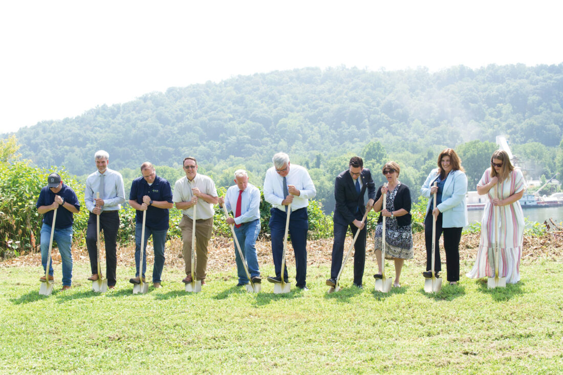 (Photo by Gage Vota) State and local officials broke ground Friday on the new Appalachian ECOTONE riverfront amphitheater and trails on Ohio 7 in Sardis. From left: James McKeegan, vice president of Grae-Con; Matt Brake, Swiss Valley Associates engineer; Graham Ferry, Mannik-Smith Group engineering manager; Gabe Hays, Smith Group principal landscape architect; Mick Schumacher, Monroe County commissioner; John Carey, Office of Appalachia Director; Monroe County Treasurer Taylor Abbott; Monroe County Commissioner Diane Burkhart; Buckeye Hills Regional Council Director Chasity Schmelzenbach; and Jessica Keeton Ironton-Lawrence County Area Community Action Organization assistant director of community development.