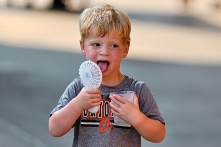 - FILE – Asher Gillen, 3, uses a battery-powered fan while holding a cup of ice to cool off during hot weather before a baseball game between the Baltimore Orioles and the Texas Rangers, June 23, 2025, in Baltimore. (AP Photo/Stephanie Scarbrough, File)