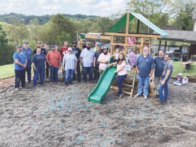 A group of volunteers from the Cornerstone Building Brands plant in Ritchie County (which includes Simonton Windows) came out Friday to the Lake Washington Road home of Hunter, Emily and Finley Knight to set up an outdoor playset provided by the Roc Solid Foundation to Finley who is undergoing cancer treatment in Morgantown. (Photo by Brett Dunlap)