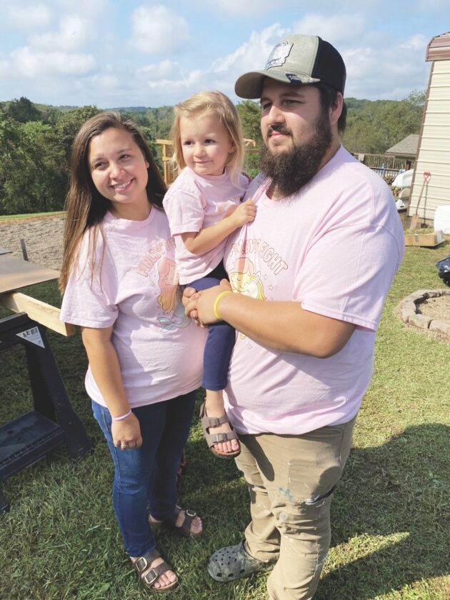 Emily, Finley and Hunter Knight had a group of volunteers from the Cornerstone Building Brands plant in Ritchie County (which includes Simonton Windows) come to their Lake Washington Road home Friday to put together an outdoor playset for 3-year-old Finley provided by the Roc Solid Foundation for kids undergoing cancer treatment. Finley is preparing to finish her chemo treatments at the end of October. She had a Wilms Tumor removed. (Photo by Brett Dunlap)