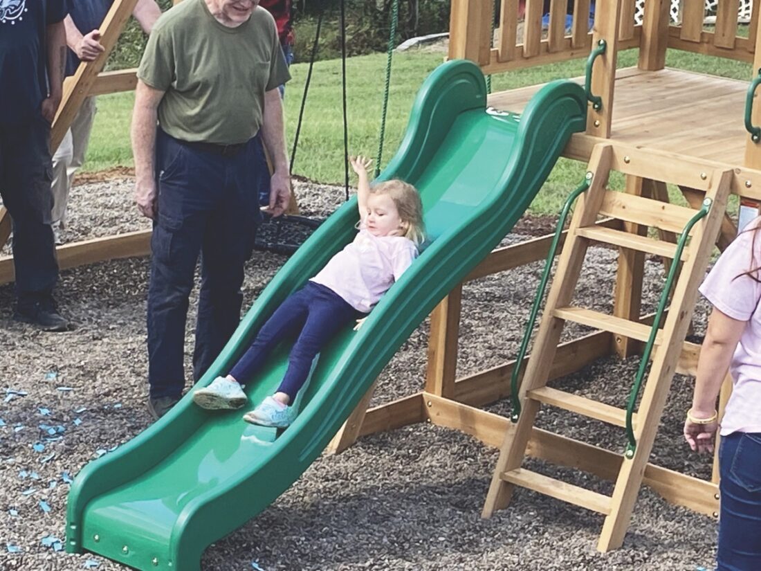 - Finley Knight, 3, tries out the slide on a new outdoor playset that was provided by the Roc Solid Foundation and put together by volunteers from the Cornerstone Building Brands plant in Ritchie County (which includes Simonton Windows). Knight has been undergoing cancer treatment since June when she had a Wilms Tumor removed and has been doing chemo therapy since. (Photo by Brett Dunlap)