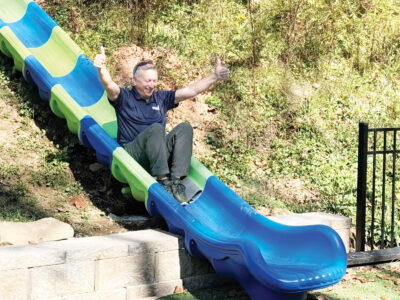 - West Virginia Department of Health’s State Health Officer Dr. Mark McDaniel slides down the slide at the Pleasants County Park. (Photo by Amber Phipps)