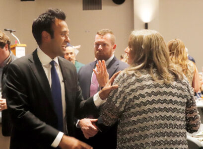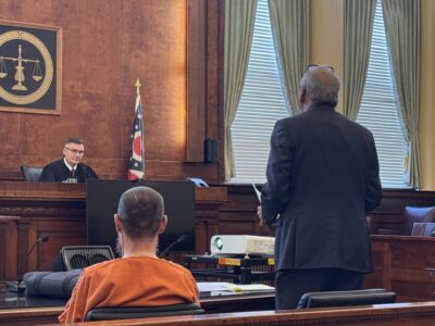 Scott Hickman, left, and his Attorney James Owens, right, reads his impact statements before the Washington County Common Pleas Court Judge Mark Kerenyi during Hickman’s sentencing on Tuesday. (Photo by Amber Phipps)