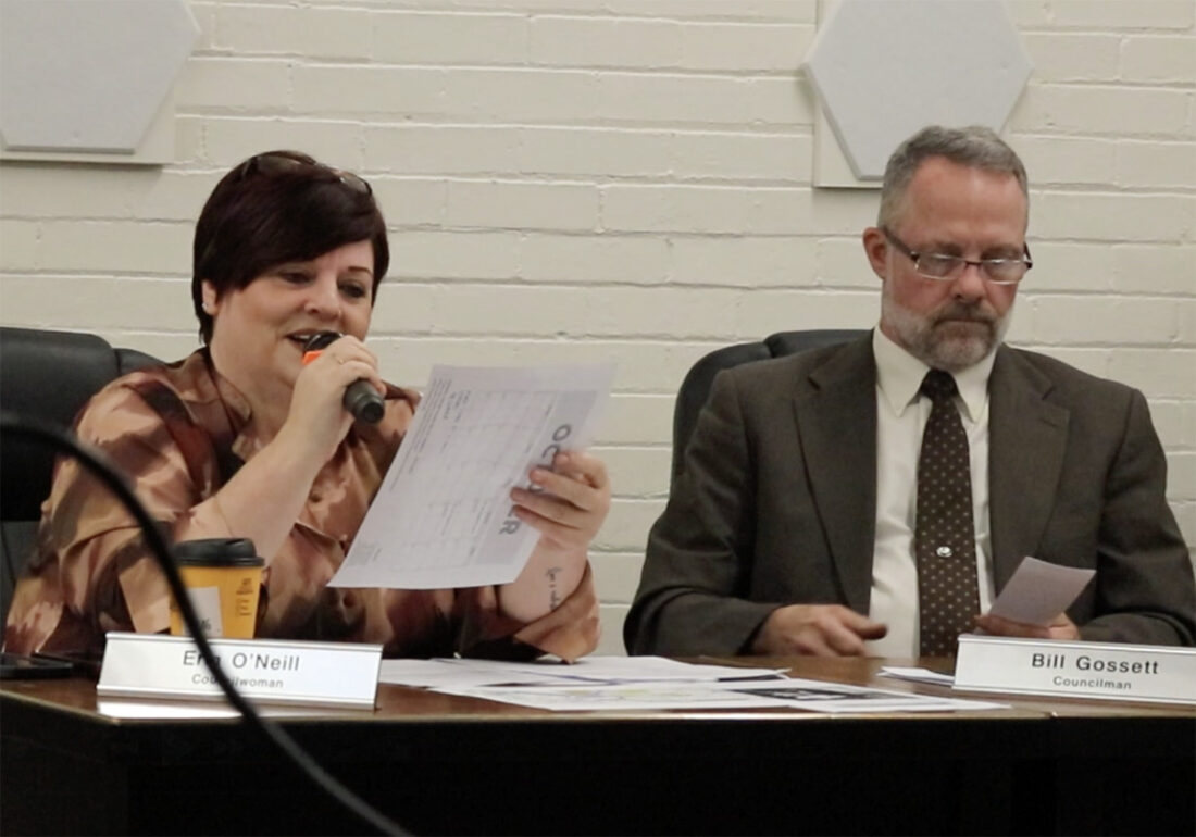 - Councilwoman Erin O’Neill, left, gives a statement thanking her fellow councilors for their efforts on the resolutions surrounding injection wells and thanks attendees for their concern regarding the issue at Thursday’s Marietta City Council meeting. (Photo by Gwen Sour)