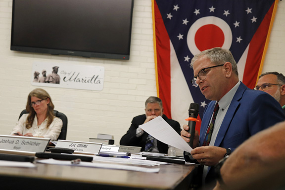 Councilman Jon Grimm updates council on communications he received from the Ohio Department of Natural Resources during Thursday’s Marietta City Council meeting. (Photo by Gwen Sour)