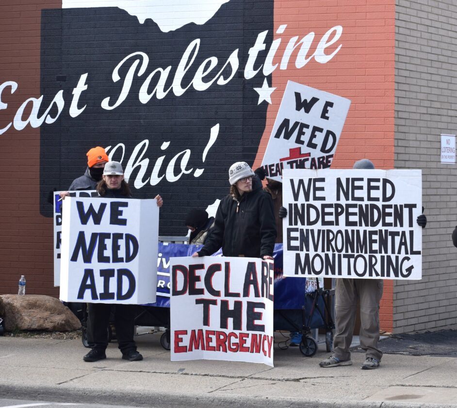 Residents hold signs expressing the need for health monitoring and environmental studies in the wake of the 2023 train derailment and chemical spill during then-President Joe Biden’s visit to the village on Feb. 15, 2024. The University of Pittsburgh received additional NIH funds this month to continue to study the impact of the rail disaster of community health. (File photo)