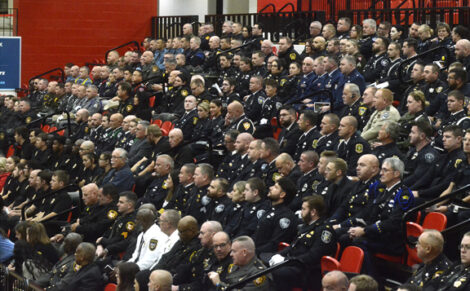 Hundreds of police officers and state patrol personnel from as far away as Louisiana filled Youngstown State University’s Beeghly Center for Ohio State Highway Patrol Trooper Nicholas P. Cayton’s public memorial service on Wednesday. (Photo by R. Michael Semple, Special to the Times)