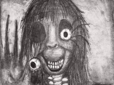 I didn’t have time to think. I ran past him. He lunged towards where I once sat. I dove into the bathroom. Immediately I began searching for something to arm myself with. All I could find was a towel holder. Realizing the door was not locked, I saw it start to open, long sharpened nails clasping the side facing me. He opened the door fully, spade in hand, and he sprung towards me. I tried to scream, but nothing came out.