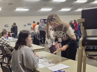 From left, Paige Lockhart operates the employment booth and helps Joy Edgell figure out how her job works at the Cost of Poverty Experience. (Photo by Gwen Sour)