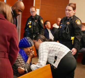 Ta'Kiya Young's grandmother, Nadine Young, reacts as the verdict is read in the trial of Blendon Township police officer Connor Grubb, who was found not guilty in the on-duty death of her daughter at Franklin County Common Pleas Court in Columbus, Ohio on Friday, Nov. 21, 2025. (Doral Chenoweth/The Columbus Dispatch via AP, Pool)