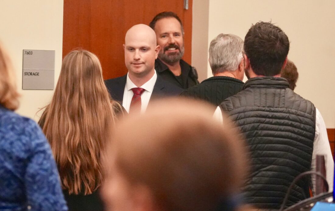 - Blendon Township police officer Connor Grubb greets a family member Friday, Nov. 21, 2025 after the not guilty verdict is read at Franklin County Common Pleas Court in Columbus, Ohio on Friday, Nov. 21, 2025. (Doral Chenoweth/The Columbus Dispatch via AP, Pool)