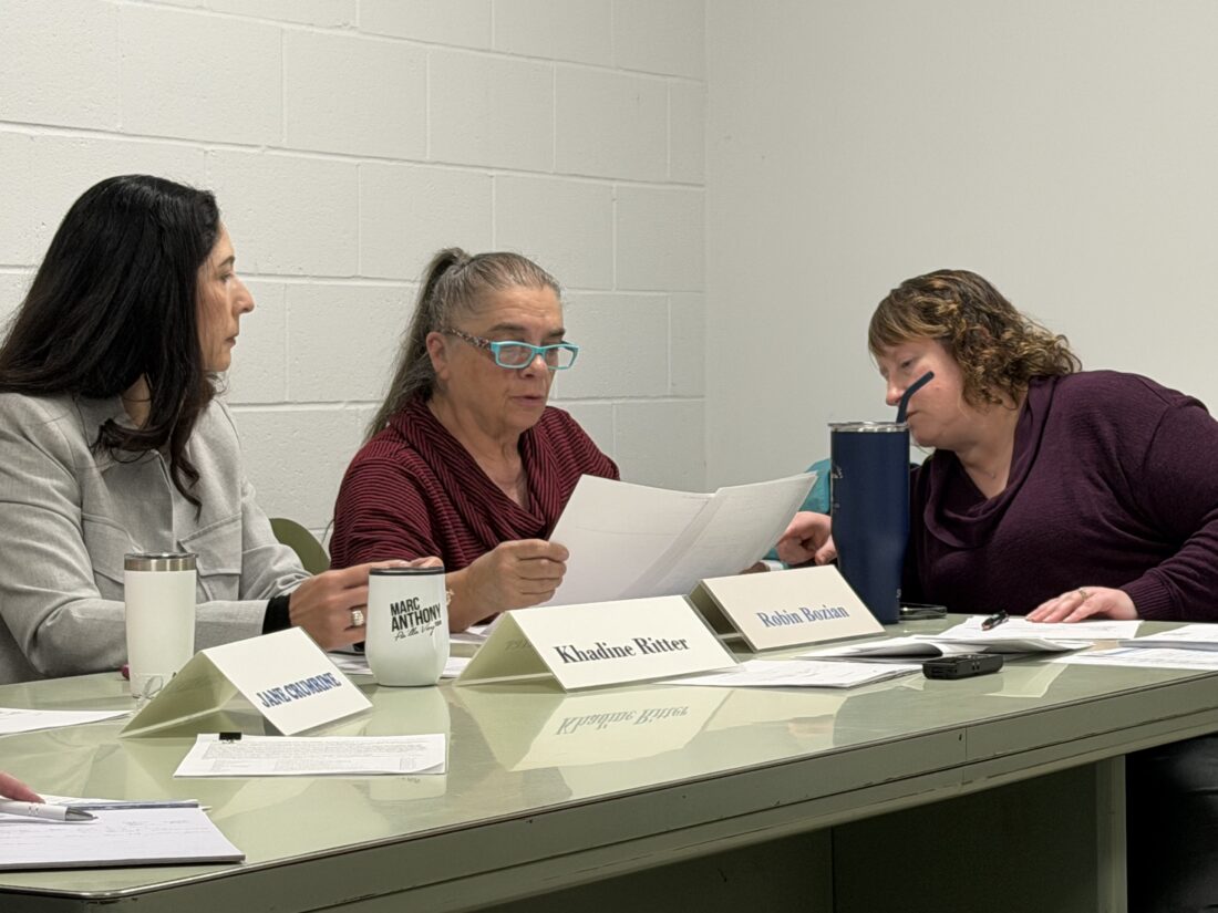 Washington County Board of Elections board members Khadine Ritter and Robin Bozian and Director Mandy Amos review a handmarked provisional ballot during the ballot recount on Wednesday. (Photo by Amber Phipps)