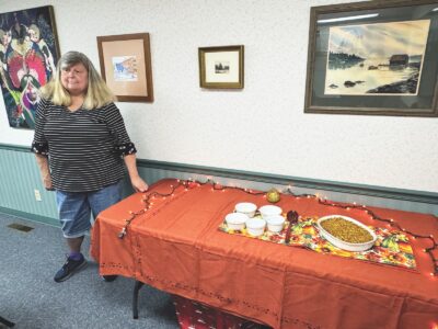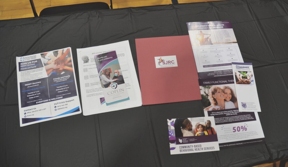 Sarah Casseday, right, director of behavioral health at Coplin Health Systems, shares information with other mental health care specialists Monday at Edison Middle School. (Photo by Douglass Huxley)