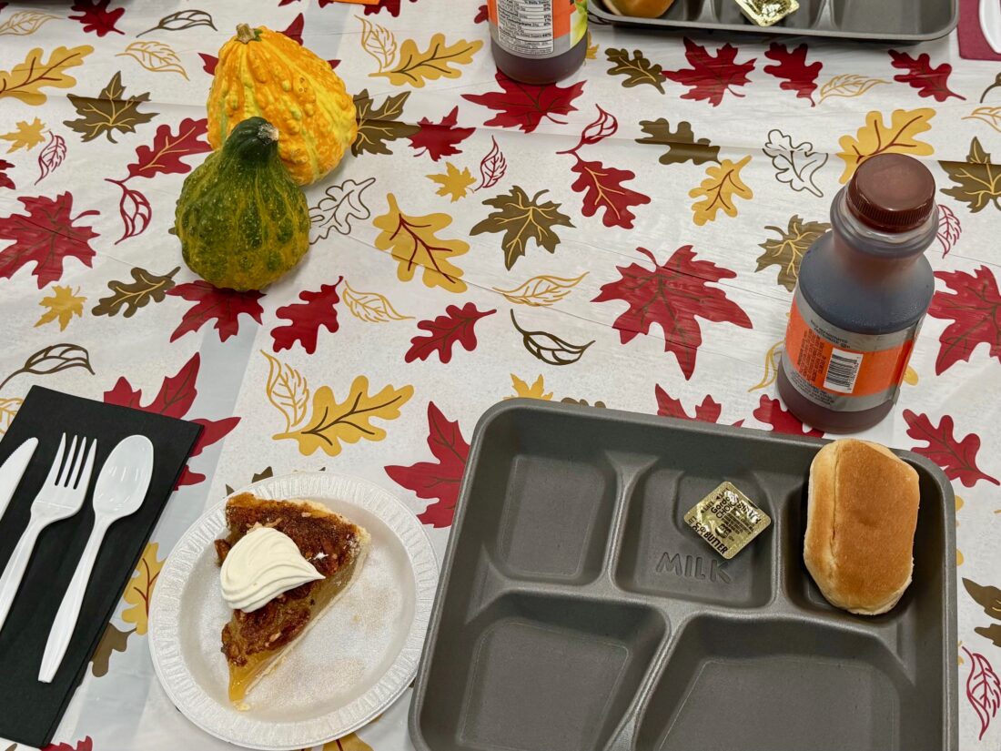 The Thanksgiving lunch included freshly cooked turkey, mashed potatoes and gravy, dinner rolls, stuffing, green beans and pie. There were options for drinks like juice or sweet tea.